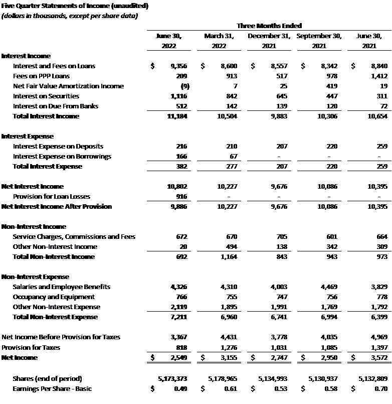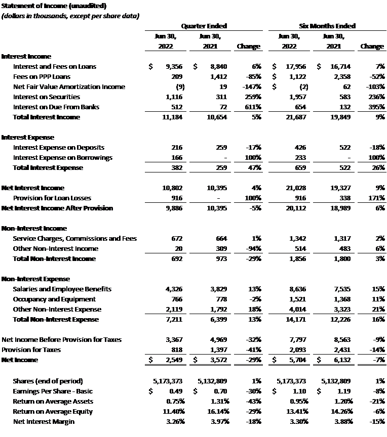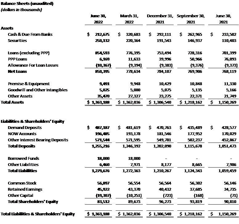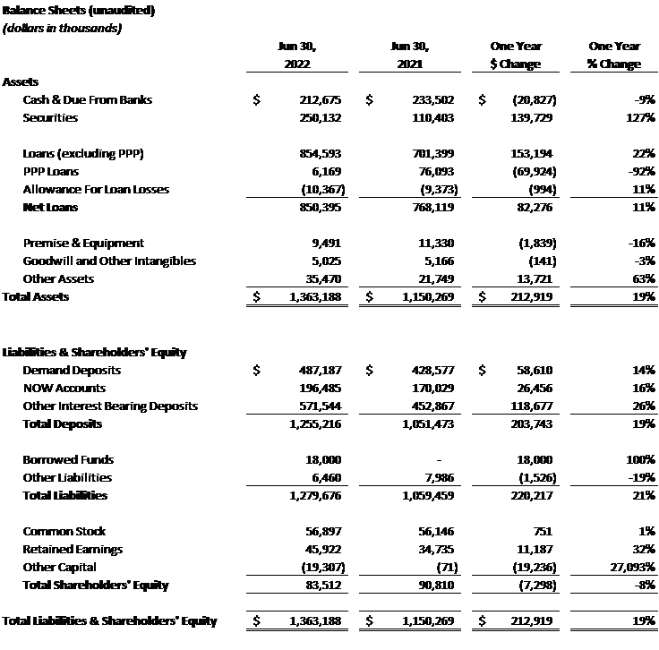 The Bank continues to experience substantial deposit growth with a 19% or $203.7 million increase in total deposits over the last year since June 30, 2021. Non-interest-bearing demand deposits increased 14% or $58.6 million over the last year. Deposit inflows from our clients have been the driving factor in the total assets of the Company increasing 19% or $212.9 million since June 30, 2021 to a total of $1.4 billion at June 30, 2022. The Company’s overall cost of funds has increased slightly to 0.12% as of June 30, 2022, primarily attributable to interest on the subordinated notes issued in February 2022.
