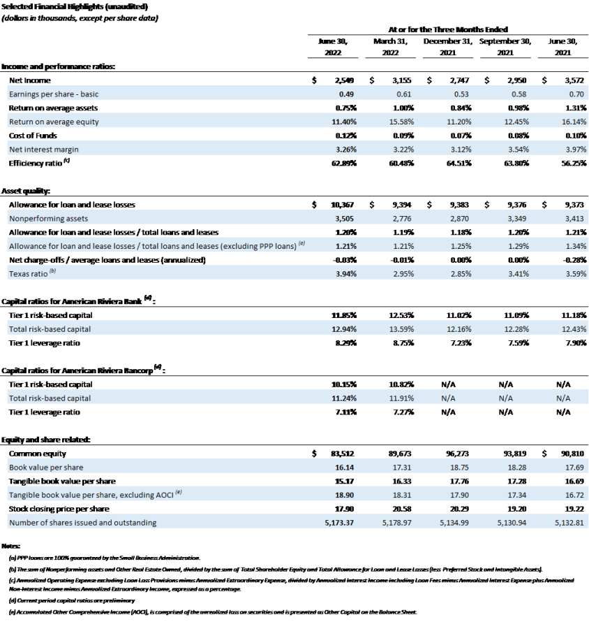 As of June 30, 2022, the Company and Bank continue to be well capitalized with Tier 1 Capital ratios of 10% and 12%, respectively. The tangible book value per share of American Riviera Bancorp common stock is $15.17 at June 30, 2022.