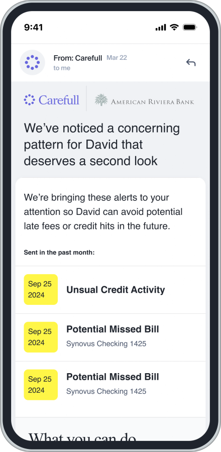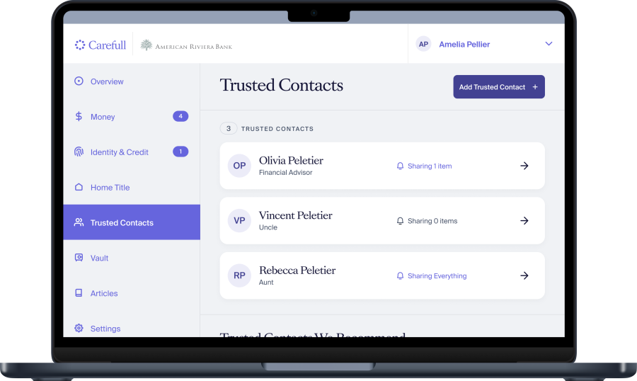 Building a strong financial safety net begins with protecting loved ones. American Riviera Bank's partnership with Carefull lets each ARB client add one additional person to the account at no cost.